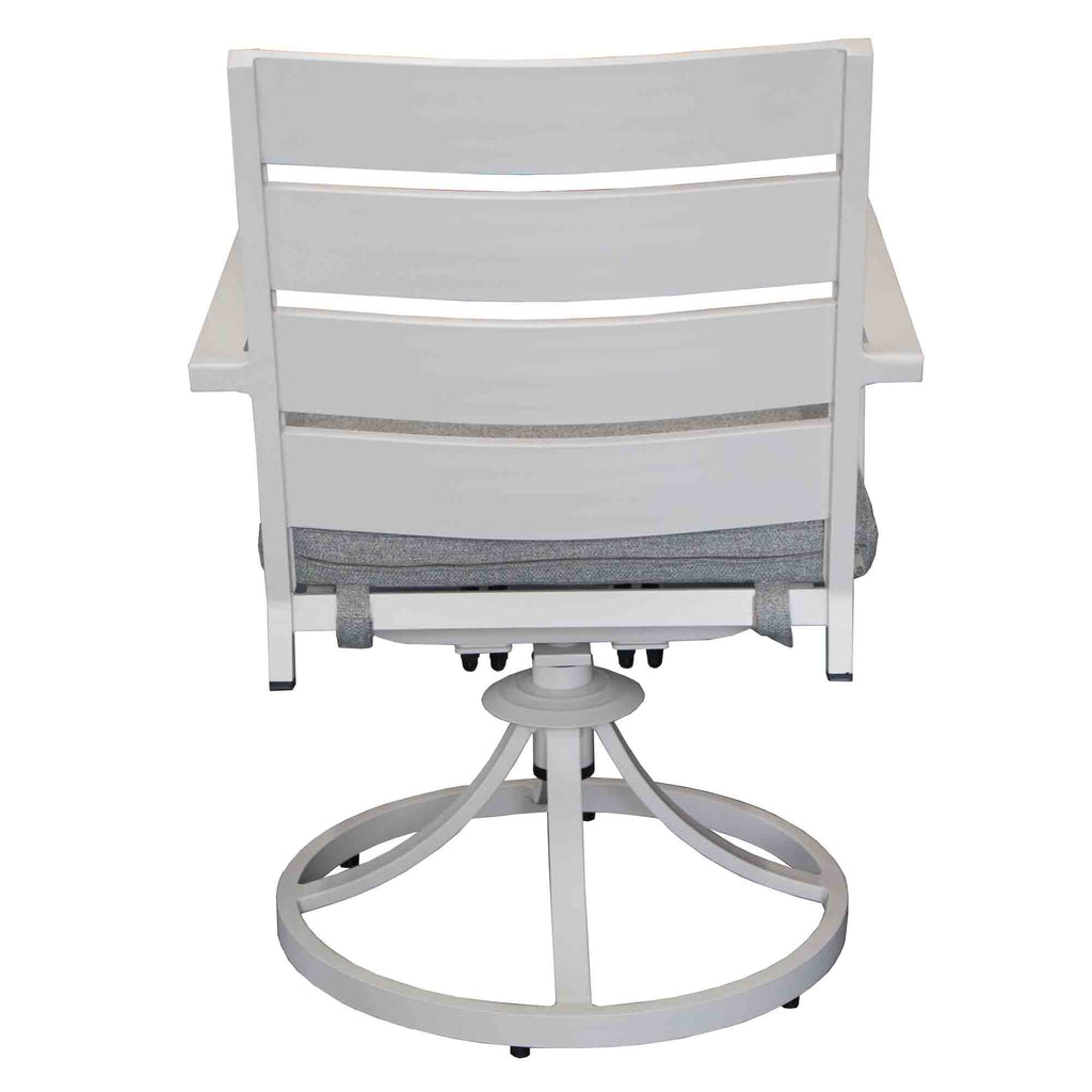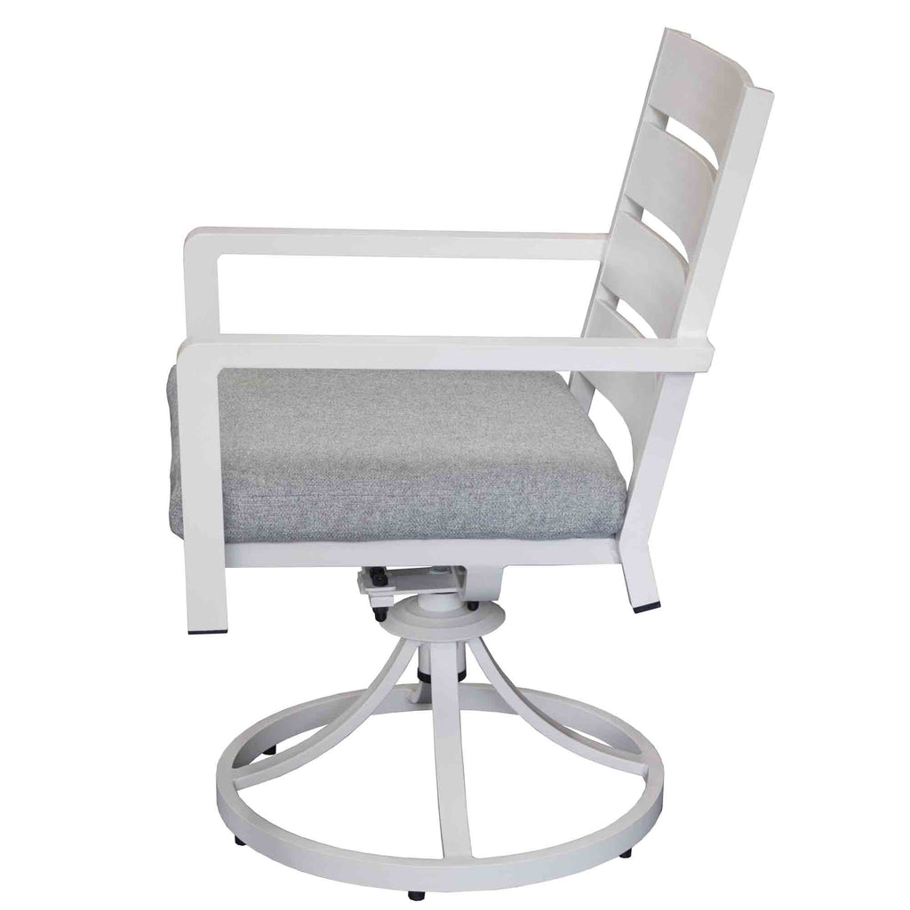 Discover our new Como swivel outdoor armchair in elegant white powdercoated aluminium finish. Designed for durability and lightweight convenience, it's weather-resistant and features a cozy cushion. Its stackable design makes it a practical and stylish choice for outdoor living.
