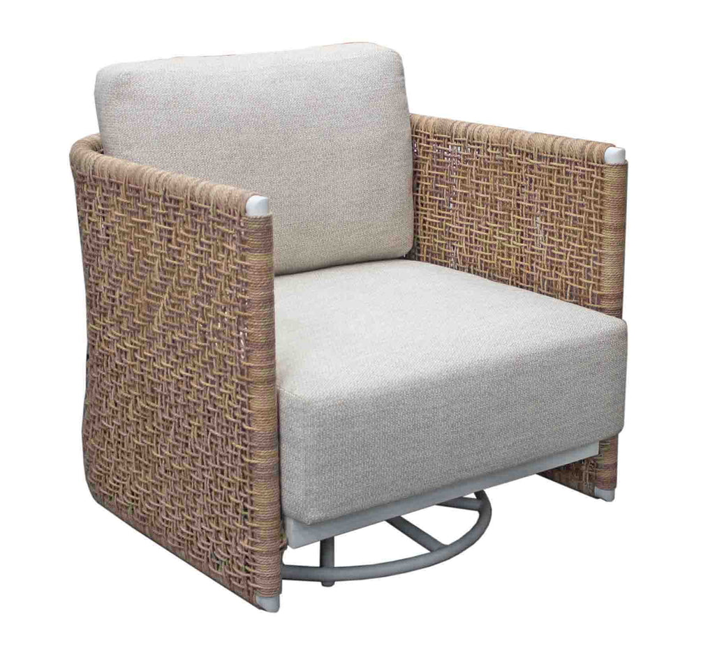 Featuring an open weave resin wicker with a brushed, twisted finish, offering a soft, natural aesthetic that blends seamlessly with outdoor surroundings. The thick base cushions, provide a refined, luxurious feel, while ensuring maximum comfort.