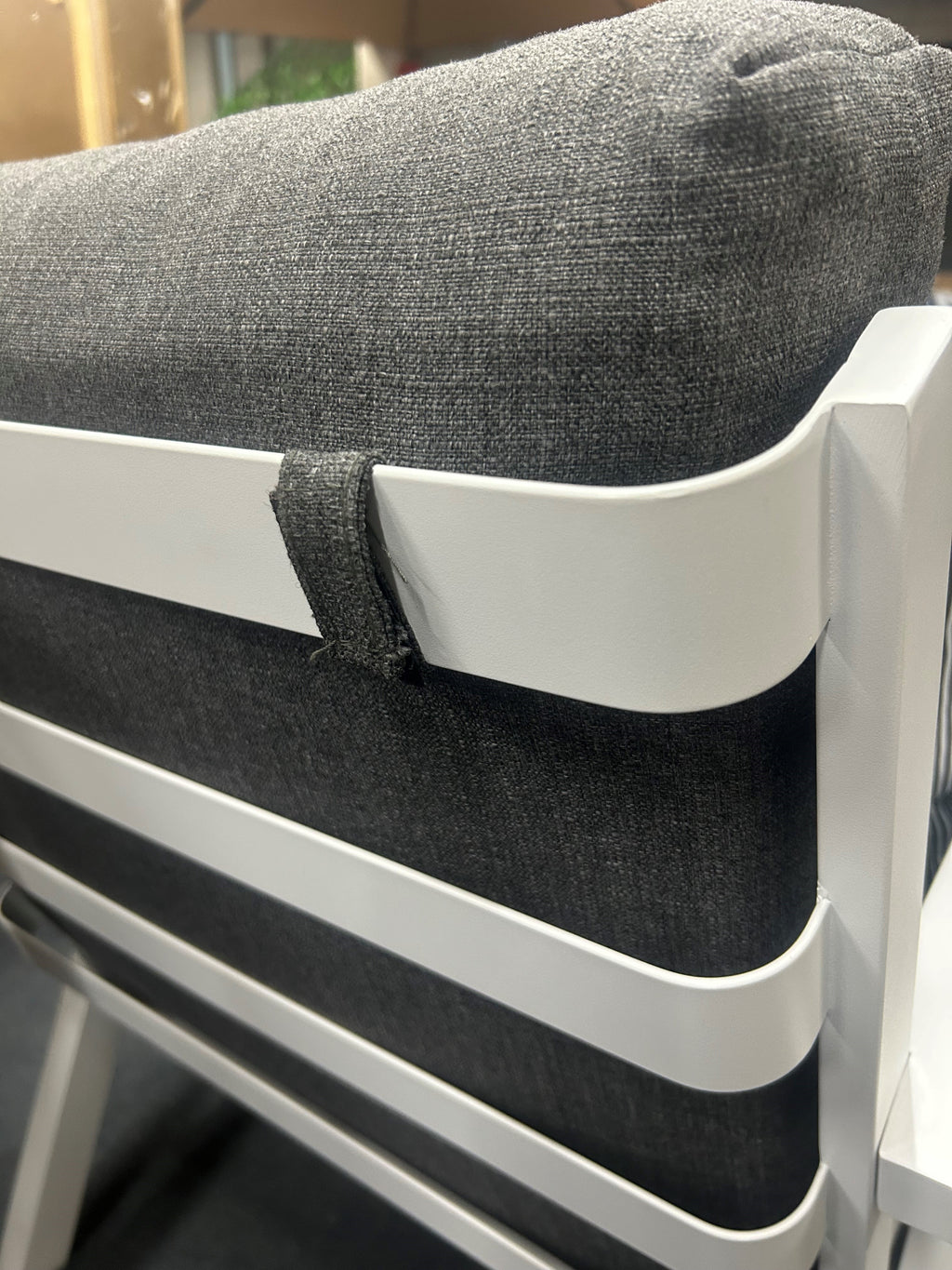 Cushions are bullnosed on the edges to silouhette the contour of your legs. The cushion covers are removable with zippers. They feature cushion ties on the back to prevent them from being blown off your balcony.