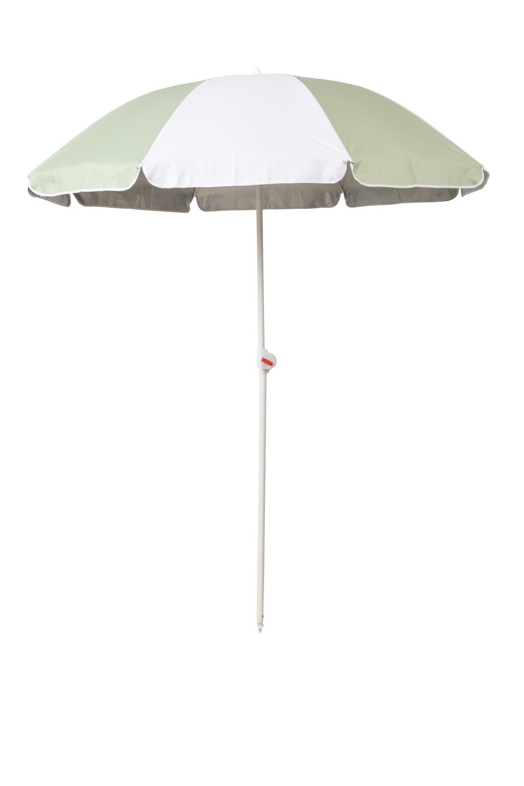 Noosa 175/8 Ribs (UPF30) Shelta’s new white striped beach umbrella on a white steel frame. Comes with a fluted sand spike and carry bag.