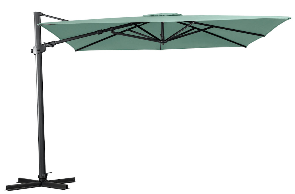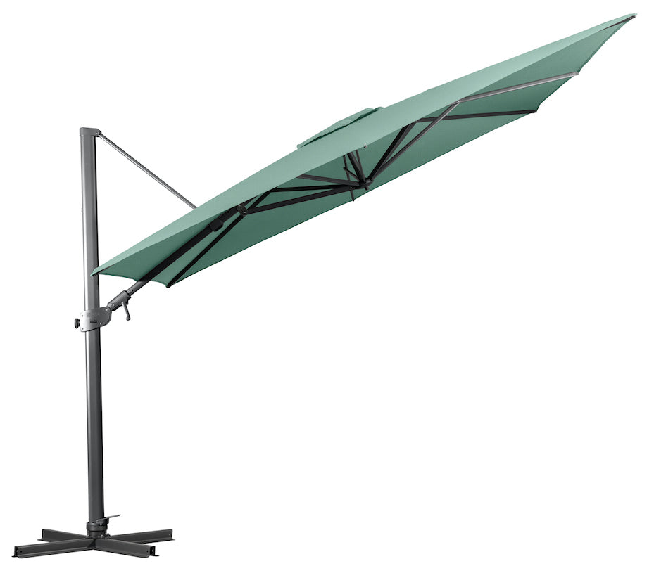 The Regis Umbrella is a great mid-size/mid-price cantilever umbrella. It uniquely features side axis winder handle controlled tilt 0 to 75º to either side; as well as normal mast axis tilt. It has a winder handle opening and closing, 360° rotation around the mast (to give shade where needed) and an LED light mount. The canopy made with O'Bravia solution dyed canvas. Installation can be with an On Ground Base Plate or Ballast Block Frame (both included). Ballast weights are an additional purchase.